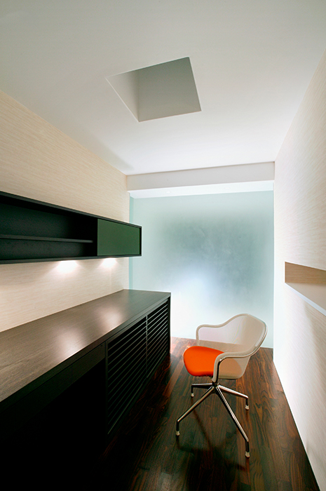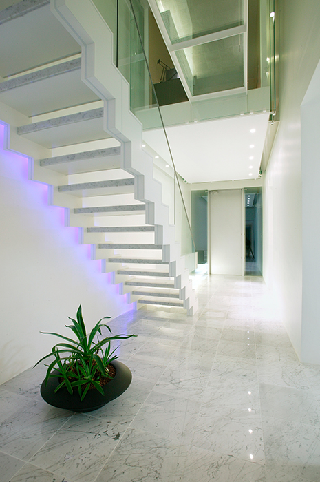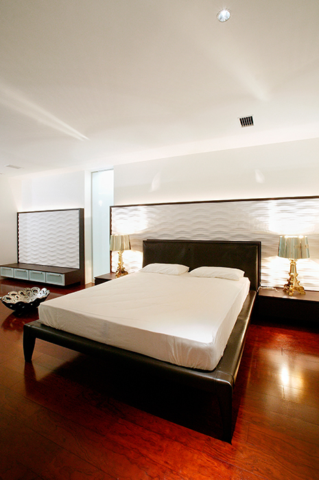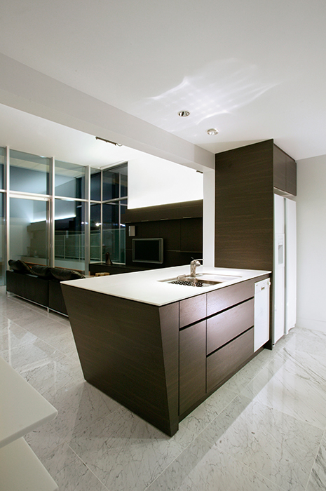 ブラックライトを車のバックから当てたり、階段にブルーの間接照明を設置したりと、新しいことに挑戦させていただきました。ベッドヘッド、キッチン、テレビボードなどすべての家具のデザインをお任せいただき、お客様好みのシャープなインテリアでまとめています。