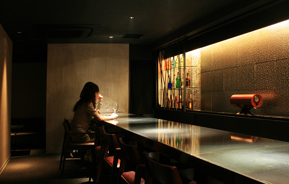 祇園にある飲食ビルの4階という限られたスペースで、カウンター数席とテーブル席一つで構成されるダイニングバーのプランです。